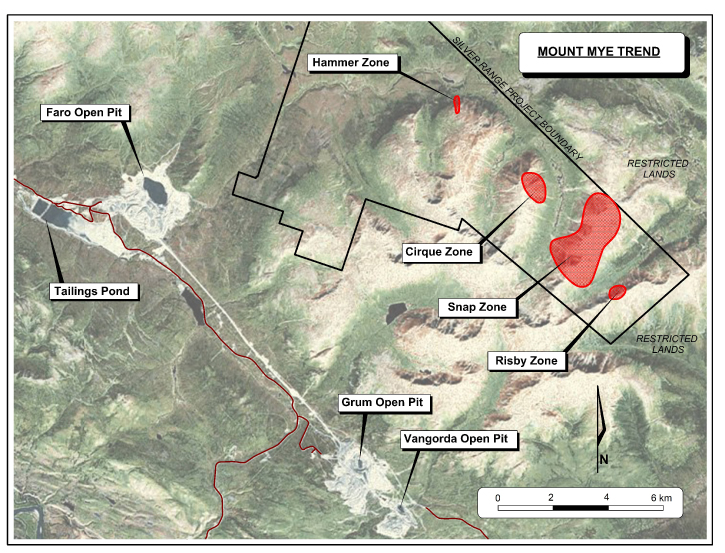 The Mount Mye Belt lies 12 km northeast of the former Faro mine and mill site, which was once Canada’s largest open pit lead-zinc producer. Maps showing the locations of the various zones and geochemical anomalies can be viewed at www.silverrangeresources.com.