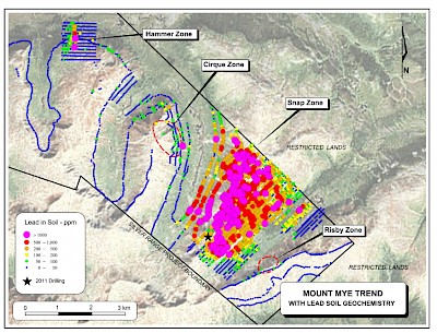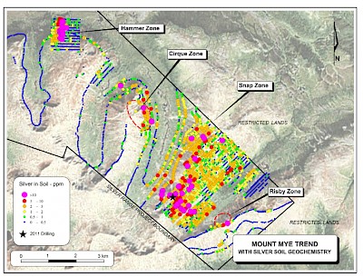 The Snap and Hammer Zones are two of several silver-bearing showings and geochemical anomalies identified within a 14 km long trend known as the “Mount Mye Belt.” Additional zones within this trend include the Cirque and Risby Zones. A well-mineralized rock sample collected in 2011 from the Risby Zone, located 700 m to the southeast of the Snap Zone, assayed 767.0 g/t silver and 8.82 g/t gold. Eighteen historical rock samples from this area averaged 426.9 g/t silver and 3.31 g/t gold. Historical trench samples returned 786.0 g/t silver and 6.5 g/t gold over 1 m as well as and 384.7 g/t silver and 2.12 g/t gold across 4 m. Twenty mineralized rock samples collected in 2011 from the Cirque Zone, located 3 km to the west of the Snap Zone, assayed from 9.04 to 2,460 g/t silver and 0.051 to 1.12 g/t gold, averaging 408.9 g/t silver and 0.22 g/t gold. The longest chip sample assayed 327.0 g/t silver, 0.089 g/t gold and 3.53% lead over 3.6 m. The high-grade mineralization at the Risby and Cirque Zones may be genetically related to the epithermal style mineralization recently discovered at the Hammer Zone.