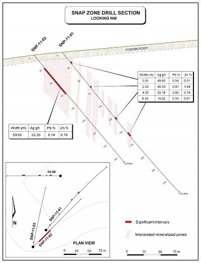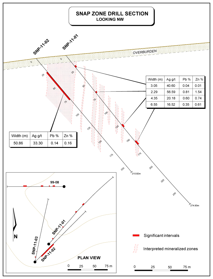 December 15, 2011 – Silver Range Resources Ltd. (TSX-V: SNG) (“Silver Range” or “the Company”) is pleased to announce results from initial drilling at the Snap Zone, part of its wholly-owned Silver Range Project. The Snap Zone lies 29 km south-southeast of the Keg Zone, the Company’s bulk-tonnage silver discovery, and 6 km southeast of the Hammer Zone, a new bonanza-grade silver discovery announced by Silver Range on December 1, 2011.