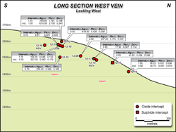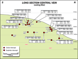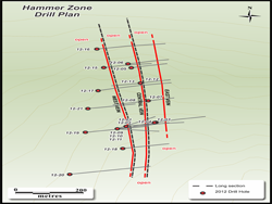 A total of 19 holes (3,904 m) were completed at the Hammer Zone in 2012. Broadly-spaced drilling traced three subparallel veins for strike lengths of up to 600 m and through a vertical range of 280 m. Fourteen of the 19 drill holes intercepted one or more veins in a grade range between 237 and 4,620 g/t silver. The weighted average of 16 individual vein intercepts is 807 g/t silver over an average drill intersected width of 0.66 metres. All veins are open for extension along strike and to depth. Drilling results are presented in the tables below.
