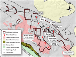 The Rebel Zone is situated in the northwestern part of the Mount Mye Trend, 6 km north of the Hammer Zone and 17 km south of the Keg Main Zone. It is associated with a broad (1,750 by 1,100 m) area of strongly anomalous silver, zinc, lead, copper and tin soil geochemistry. Limited 2011 drilling at the Rebel Zone returned 155.84 g/t silver, 12.43% lead and 3.07% zinc over a 6.16 m interval. An historical drill hole in the Rebel area averaged 2.28% zinc, 0.10% lead and 0.10% copper over 61 m, with no assays reported for silver and other elements.