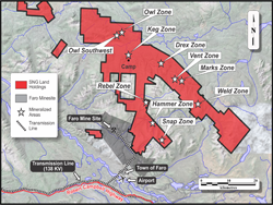 The Hammer Zone is a bonanza-grade, silver-rich epithermal vein system that was discovered in late 2011. It is located 12 km from the historical Faro mine and mill site.