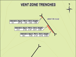 The Vent Zone is a new discovery located 20 km east-southeast of the Keg Main Zone. It is associated with a very strong 600 by 400 m silver-arsenic-lead soil anomaly. Ten samples of mineralized quartz veins and altered pyroclastic rocks collected throughout the Vent soil anomaly returned more than 150 g/t silver, with a peak value of 673 g/t silver. Limited excavator trenching returned 247.08 g/t silver and 1.304% lead across an 8 m interval that remains open to extension on one side. Other trench results indicate potential for bulk tonnage mineralization, with values including 21.02 g/t silver over 21 m. These results were obtained too late in the season to drill.
