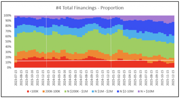 Total financings raised are in “good” territory, recently well above the $550M per two-week threshold for a good market. In fact, the unfiltered financings for December 1-15 were C$1.70B, the second highest since June 2023, second only to the latter half of October this year. In aggregate, markets are in good condition but keep in mind this figure is dominated by a small number of very large financings. At the bottom end of the market, it’s a different story. The amount of money being raised in critical smaller financings (< C$2M) is at best “okay”, beating the C$35M basement threshold.