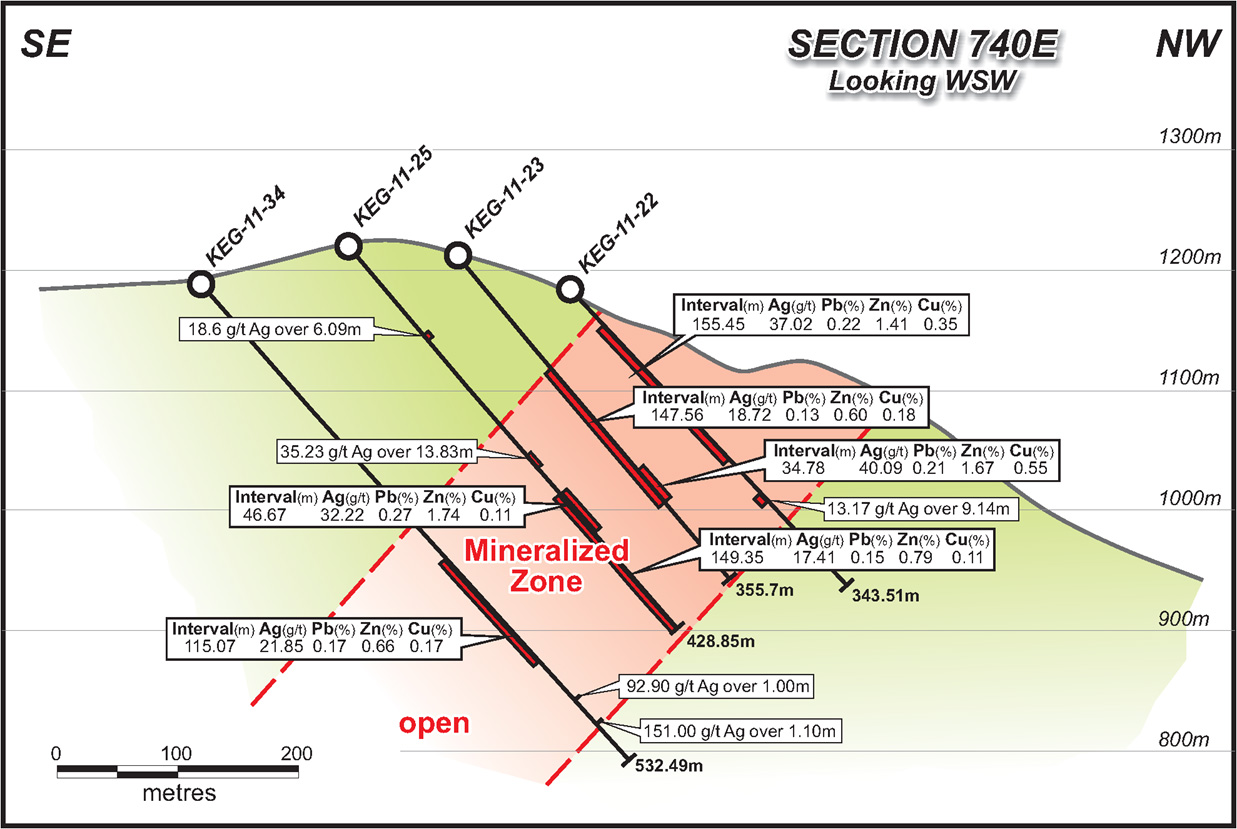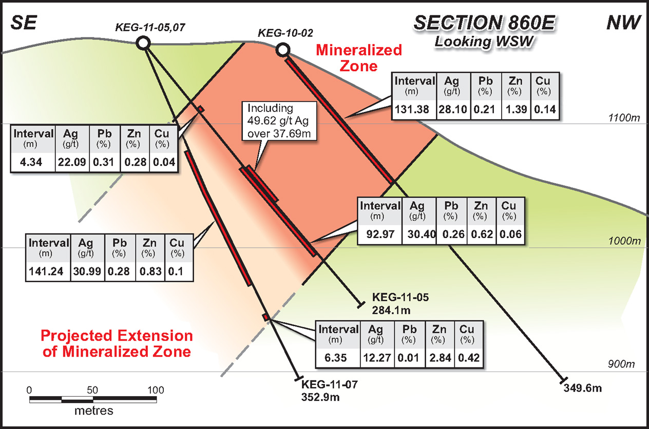 Systematic grid drilling in 2011 and 2012 successfully outlined bulk tonnage silver-polymetallic mineralization at the Keg Main Zone along a 1,100 m strike length and to depths up to 375 m. In November 2012, an initial resource estimate and excellent metallurgical results were announced for the Keg Deposit.