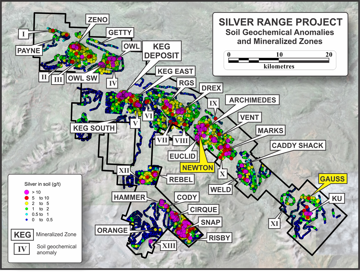 Collectively, 26 silver-bearing mineralized zones and numerous other soil geochemical anomalies now identified on the Silver Range property define two major district-scale trends: the 70 km long Tay Trend, which includes the bulk tonnage Keg Zone Deposit, and the 17 km long Mount Mye Trend, where high-grade silver mineralization has been discovered at the Hammer Zone and other high-grade targets including the Cody, Cirque, Risby and Snap Zones. In the Tay Trend, mineralization is usually found in sedimentary units and silver occurs with mesothermal base metal minerals. Zones within the Mount Mye Trend are mostly hosted by granitic rocks, are often epithermal and are locally gold enriched.