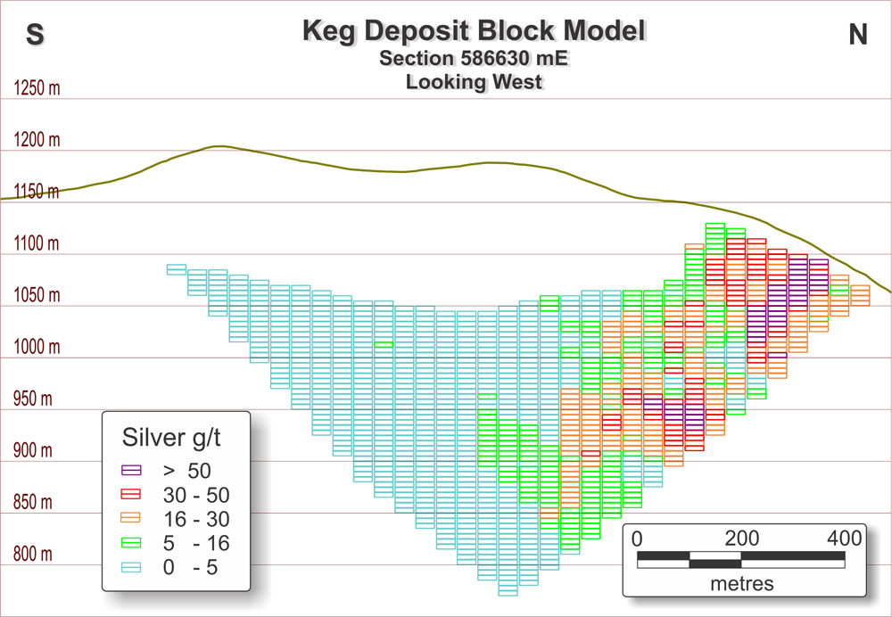 At a cut-off grade of 16 g/t silver, the Keg Deposit hosts an inferred resource of 39.8 million tonnes grading 30.3 g/t silver with contained metal estimates of 38.7 million ounces of silver, 675 million pounds of zinc, 228 million pounds of lead, and 131 million pounds of copper: