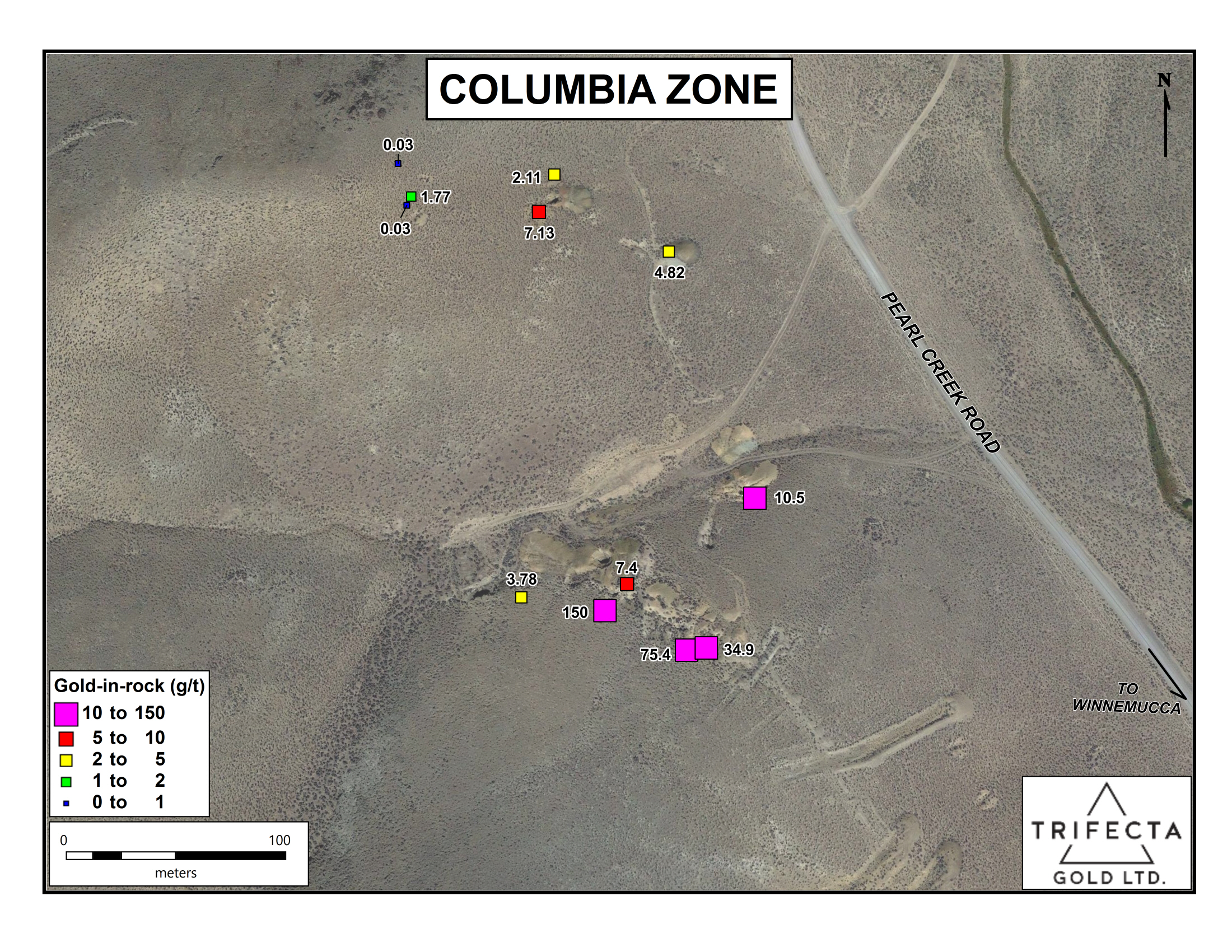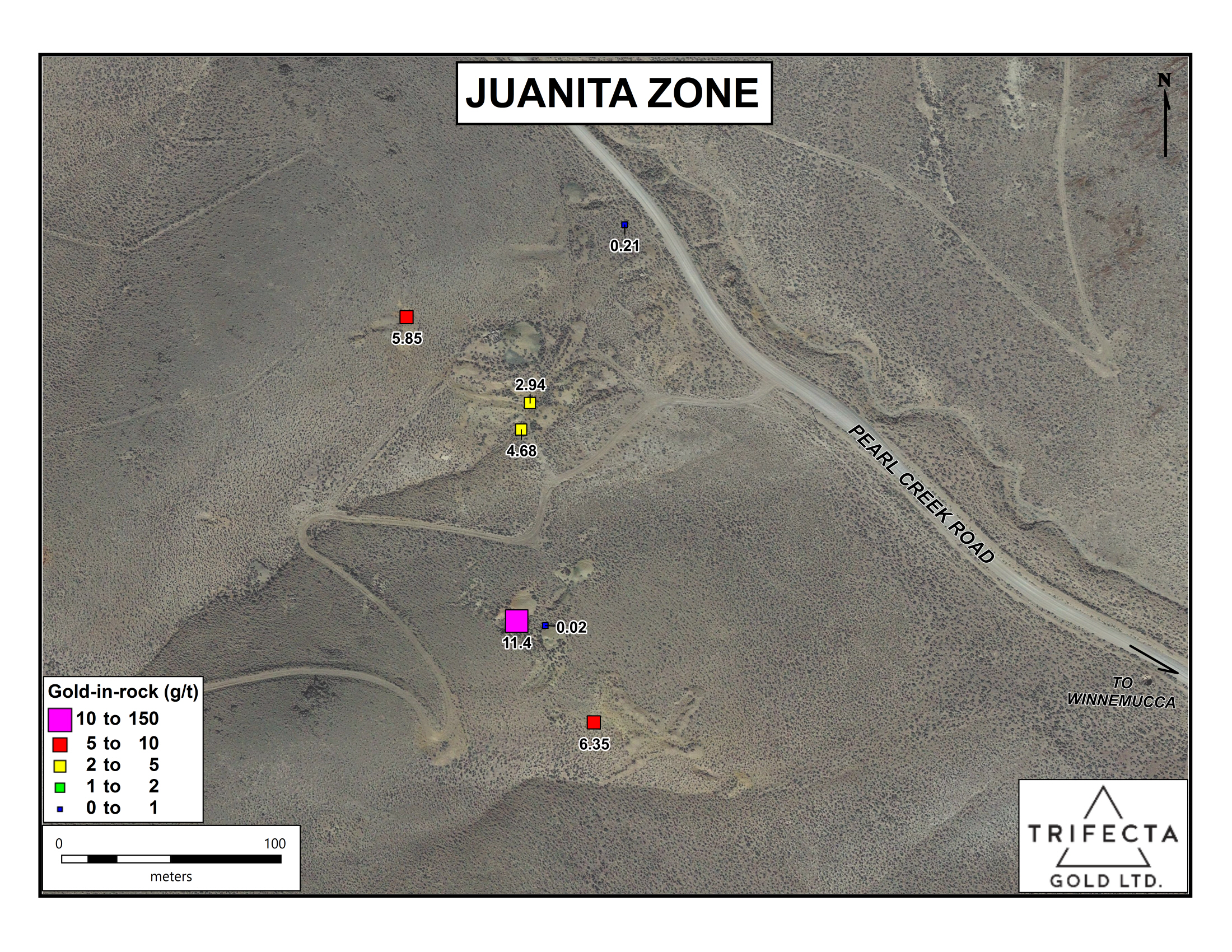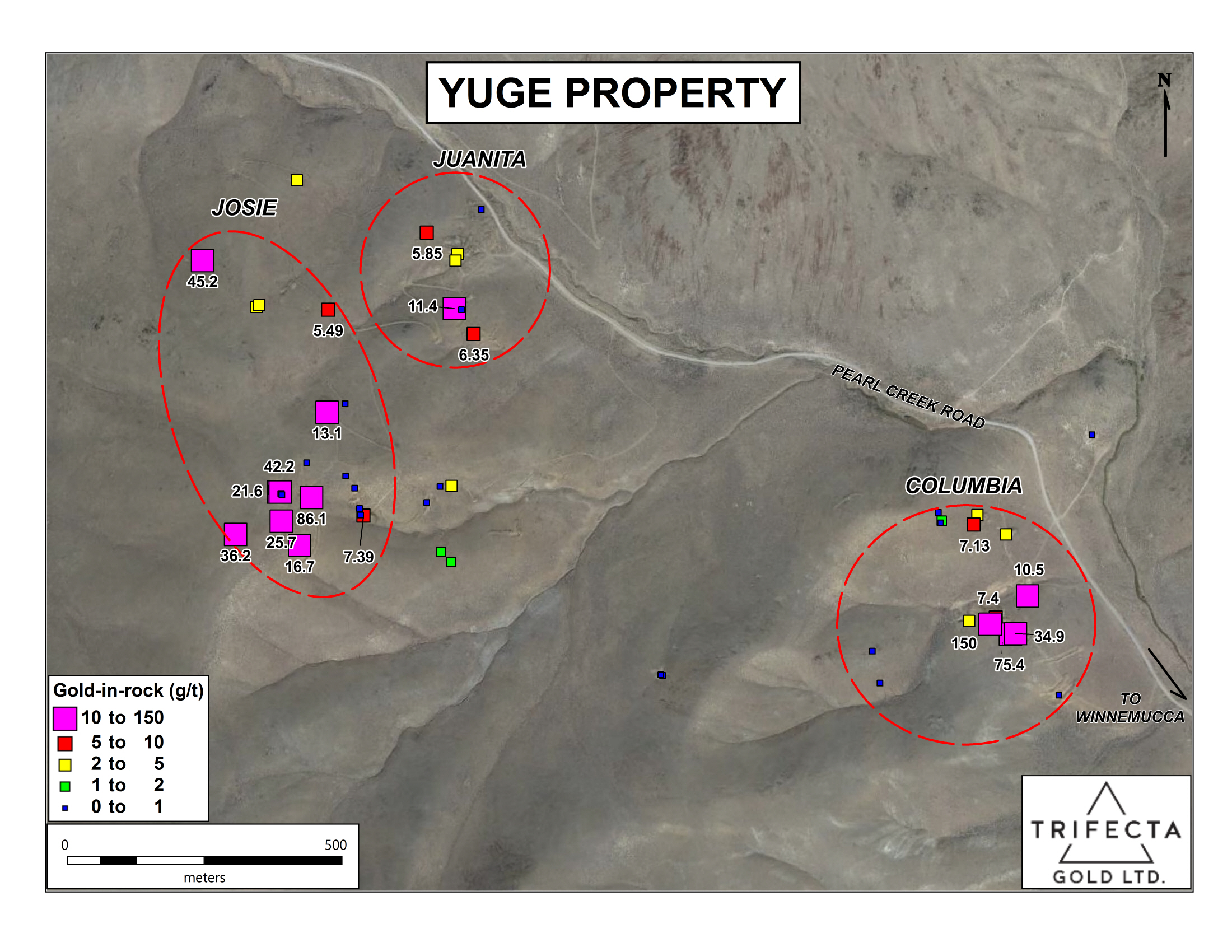 The Yuge Gold property, owned by Trifecta Gold Ltd. (TSX-V:TG), is located in Humboldt County, approximately 55 kilometres south of Denio in the Varyville Mining District. Silver Range retains a 2% Net Smelter Return Royalty (“NSR”), half (1%) of the NSR can be purchased for US$1,000,000. Silver Range is also entitled to a one-time cash payment (“Defined Resource Payment”) of US$2.00 per ounce of gold (or the value equivalent in other metals) based on the number of ounces of gold (or the value of equivalent in other metals) identified in the earlier of a measured or indicated mineral resource, or a proven and probable mineral reserve, as contained in a NI 43-101 compliant technical report applicable to the Property.