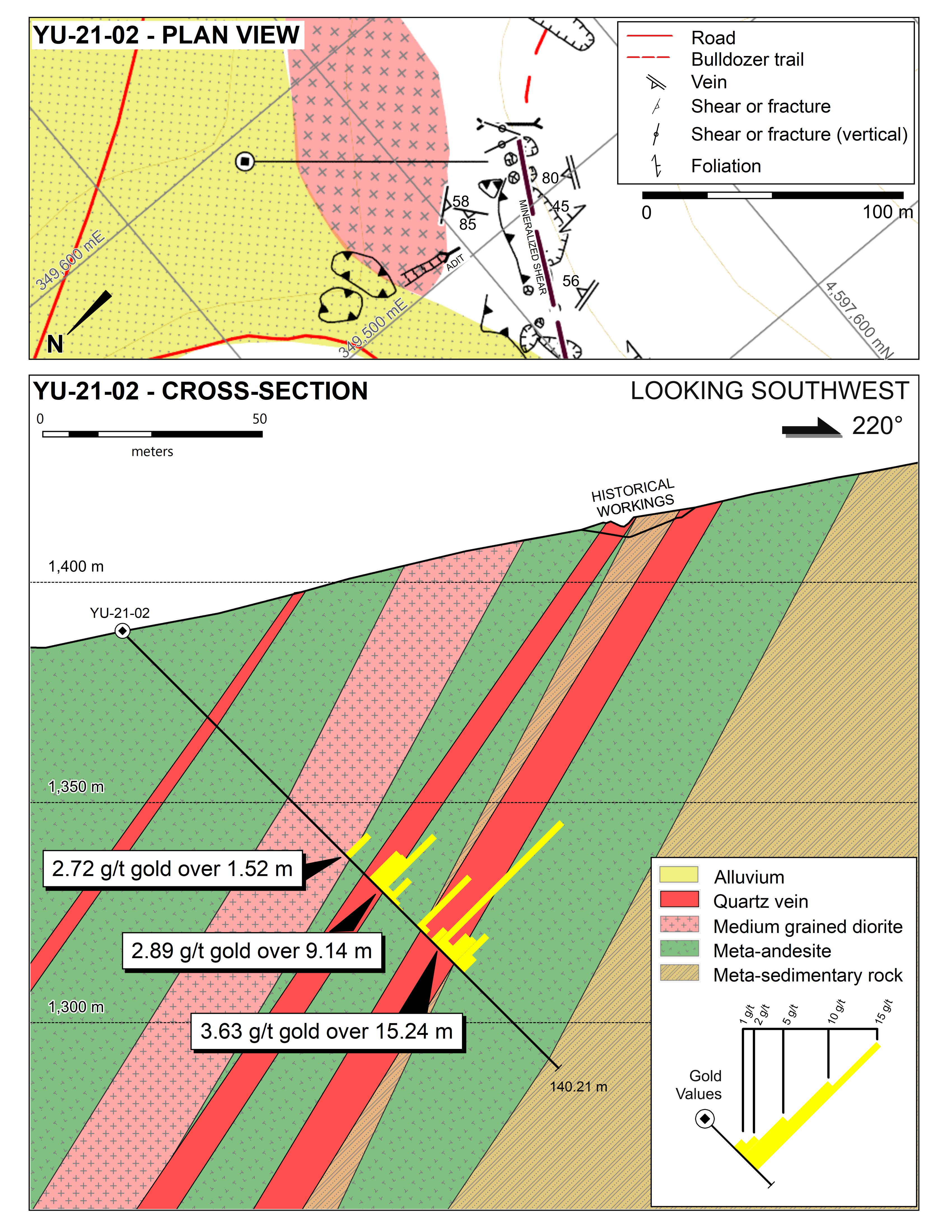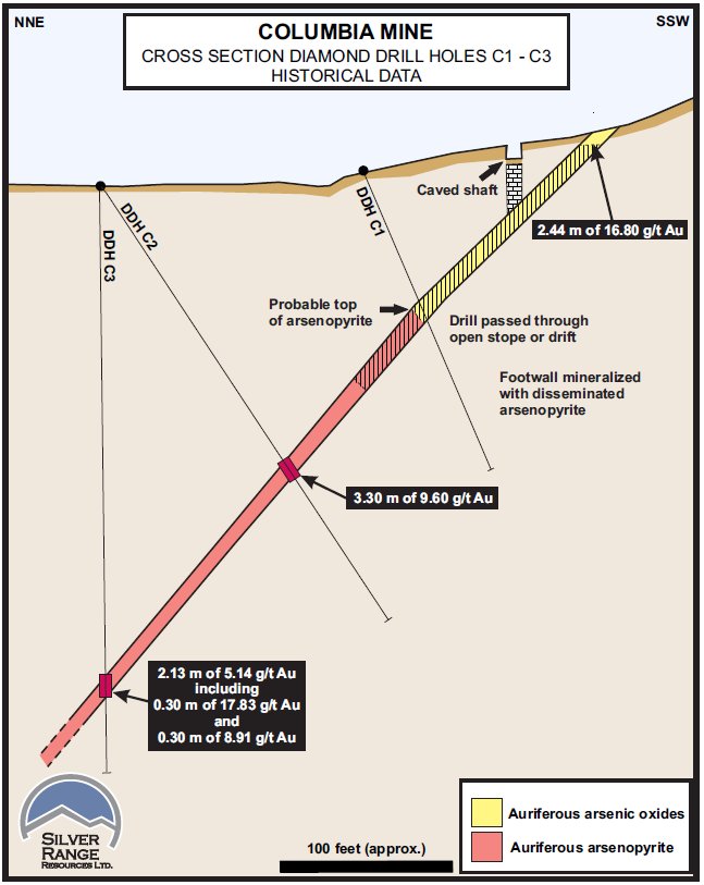 Gold on the Yuge property occurs with arsenopyrite in mesothermal quartz veins and adjacent wall rock. These occur in sub-parallel shear zones up to 60 m wide and over 1,200 m long. Selected surface grab samples collected on the property by the Nevada Bureau of Mines and Geology returned assays up to 15 g/t Au and similar samples collected by Homestake Mining Company assayed up to 53.0 g/t Au. Highest gold grades were reported from near-surface oxidized vein material where documented run-of-mine sorted ore assayed greater than 34 g/t Au and reported sampling of a crown pillar returned 2.4 m @ 16.8 g/t Au including 0.6 m @ 50.7 g/t Au. Sulphide ore occurs at depths greater than 30 m with arsenopyrite-rich material reportedly assaying greater than 17.4 g/t Au. A reported true-width drill intersection in this material at 49 m depth returned 3.3 m @ 9.70 g/t Au. Historical drilling intersected gold mineralization or open stopes in all holes reported but only to a maximum depth of 100 metres. Silver Range believes there is considerable potential to discover similar mineralization at depth given the mesothermal character of the veins and shears and the considerable depth extent of gold mineralization in deposits of this class.