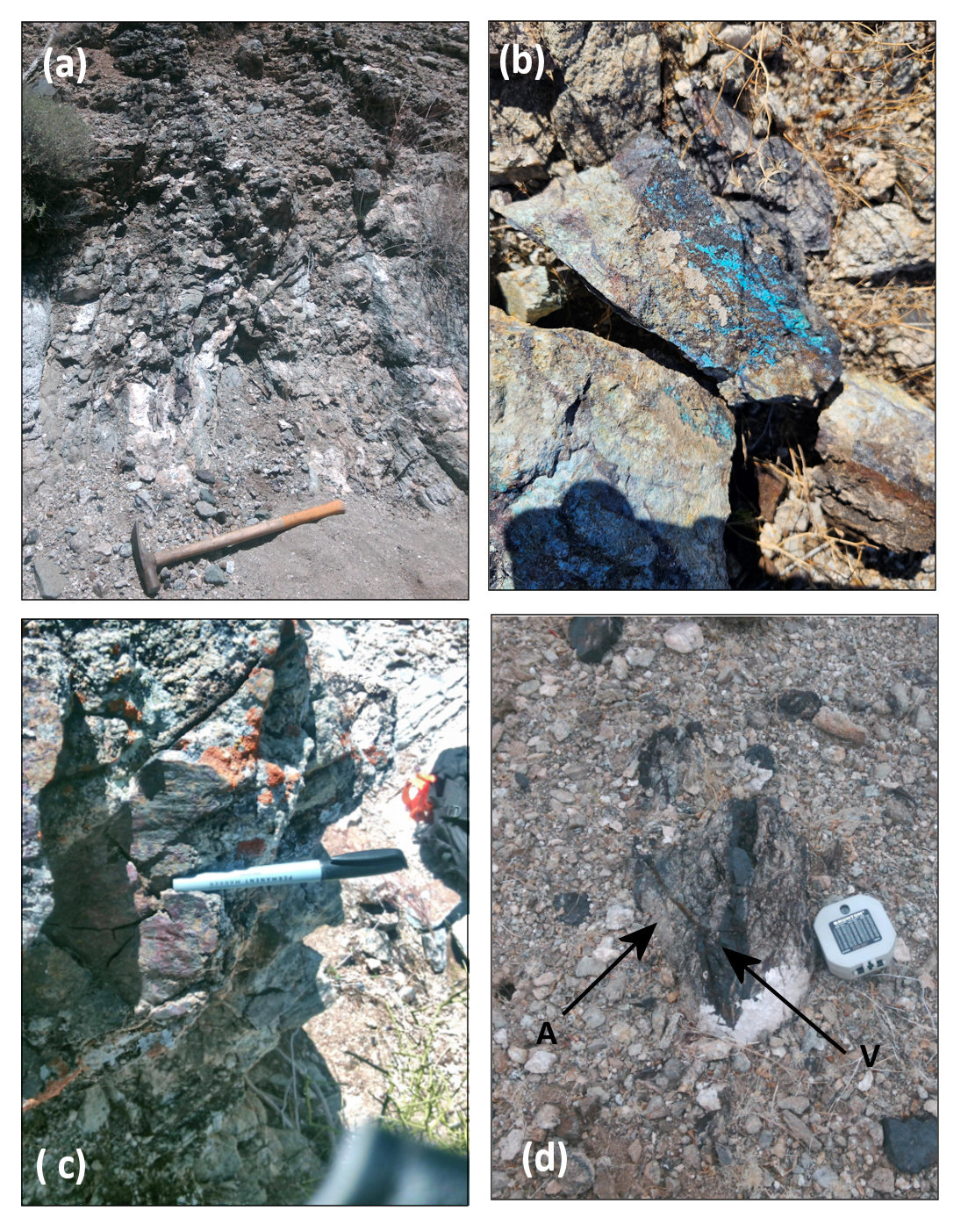 Mineralization in the district consists of specular and earthy hematite with limonite in brittle structures cutting Proterozoic gneiss. Gold reports with chalcopyrite and pyrite, largely oxidized to malachite, azurite, chalcocite and limonite. The mineralization occurs as vein-fill in northwest-striking, northeast-dipping anastomosing faults with dips varying from 30o to 90o. Individual vein-filled faults at larger mines in the area are from 50 to 150 m in length and occur in networks. Mineralization in the district is iron-oxide copper-gold (IOCG) in style, hosted in a detachment-fault related extensional normal faults along a mean trend of approximately 330o. A bulk tonnage copper-gold target might be present where converging and intersecting structures have created large damage zones.