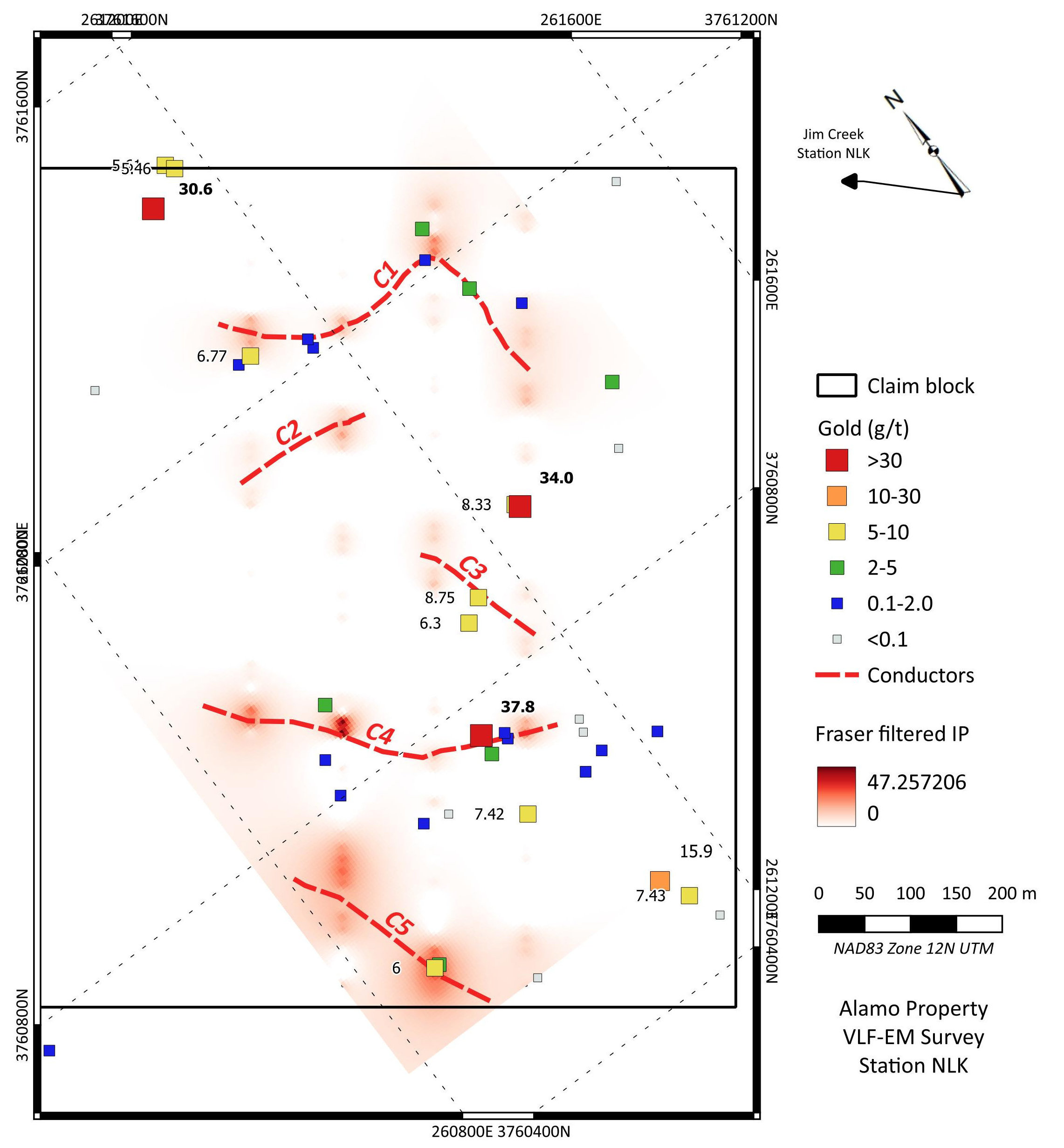 Silver Range acquired the Alamo Property by staking in February 2025 and has conducted geological mapping, sampling, soil geochemical surveys and VLF-EM surveys on the property since then. Sampling to date has returned up to 37.8 g/t Au and 19.15% Cu. Gold grades in surface grab samples collected to date (48) average 4.39 g/t Au with 27% returning more than 5 g/t Au. Copper grades in the same set average 2.47% Cu with 33% returning greater than 2% Cu. Soil geochemical survey in the eastern portion of the property mapped a large gold in soil anomaly greater than 20 ppb Au with maximum response of 181 ppb Au. Copper values in the same data set mapped more discrete anomalies, two of which were associated with mine workings and with maximum response of 649 ppm Cu. VLF-EM surveys identified 5 conductors in the eastern portion of the property, four of which are associated with known mineralization.