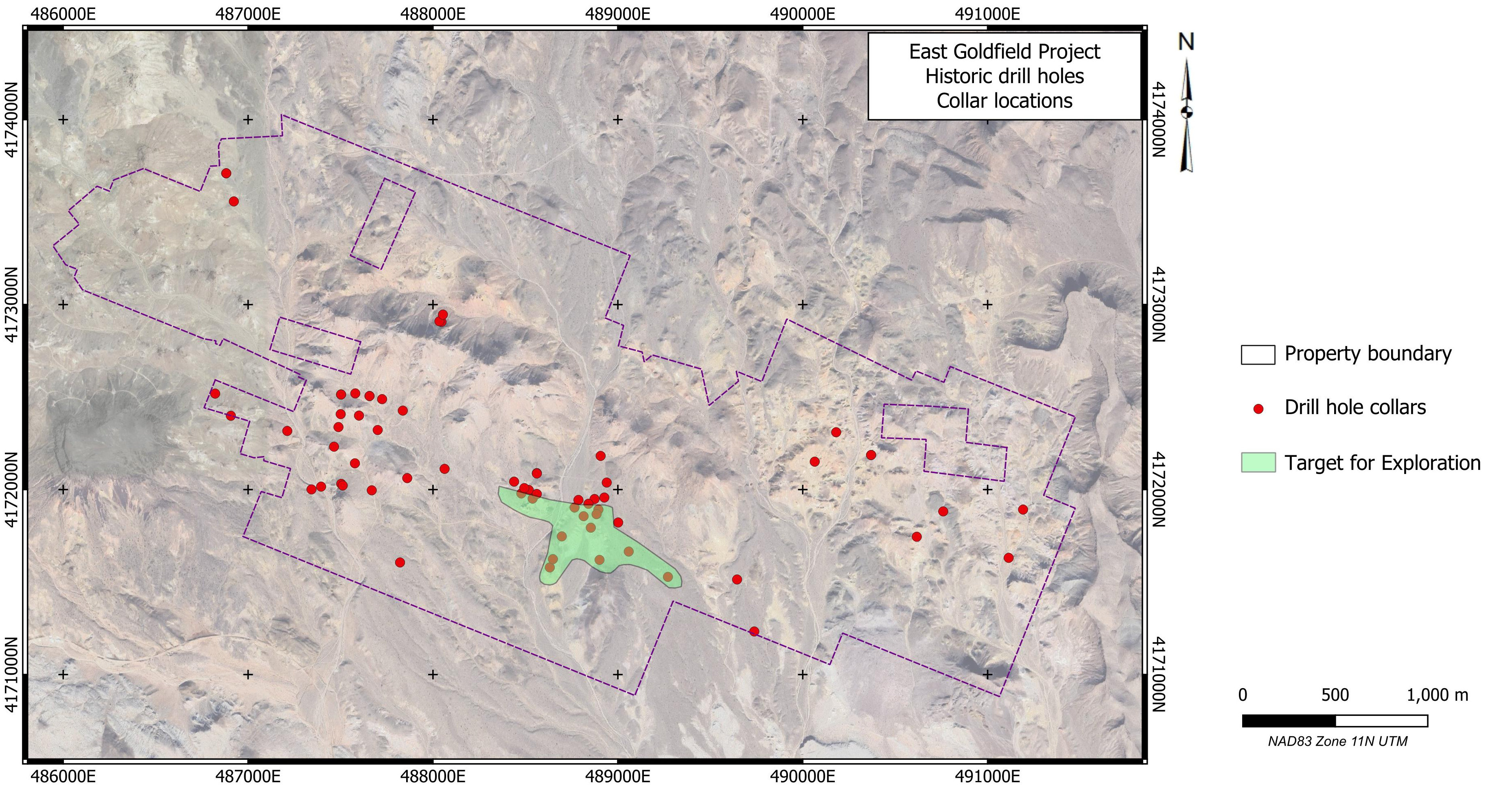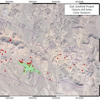 East Goldfield is a high sulphidation gold target 12 km east of Goldfield, Nevada. The property is centred at 37º 41’ 56” N 117º 7’ 41” W in Section 11, Township 3S Range 43E, Nye County, NV. The East Goldfield Project is accessible from Goldfield by road with a 4WD vehicle. The property currently consists of 110 Federal Lode Claims, sandwiched between Centerra Gold Corp.’s Goldfield Property and the Nellis Test Site (Air Force bombing range).