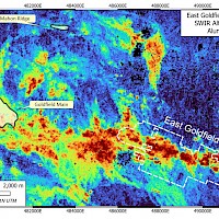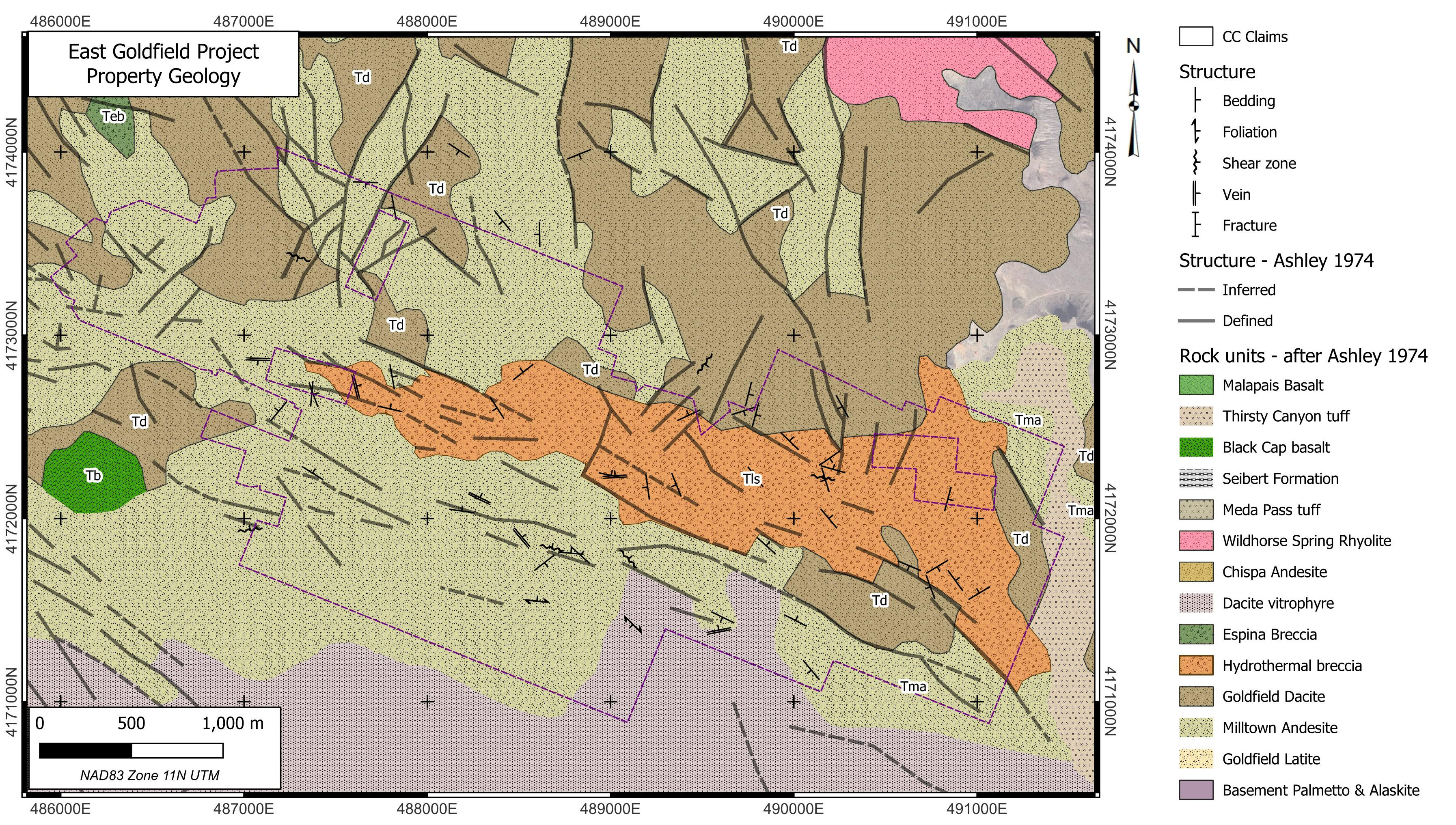 High grade gold mineralization was discovered at Goldfield in 1902 and mining was conducted continuously in the Goldfield Main area until 1952 and continued intermittently to this day at several small operations. Production to date from the district is approximately 4.2 M oz Au. Gold in the Goldfield District is found in residual (vuggy) silica ledges and replacements in permissible horizons in the Milltown Andesite, the Goldfield Dacite and underlying units. Quartz alunite alteration associated with the deposits is extensive and defines the structural controls on ore deposition. These include a circular fracture ring centred on a presumed buried intrusive body east of Goldfield and a linear feeder system connecting to the eastern margin of the circular fracture ring. The East Goldfield Project covers the linear fracture system.