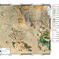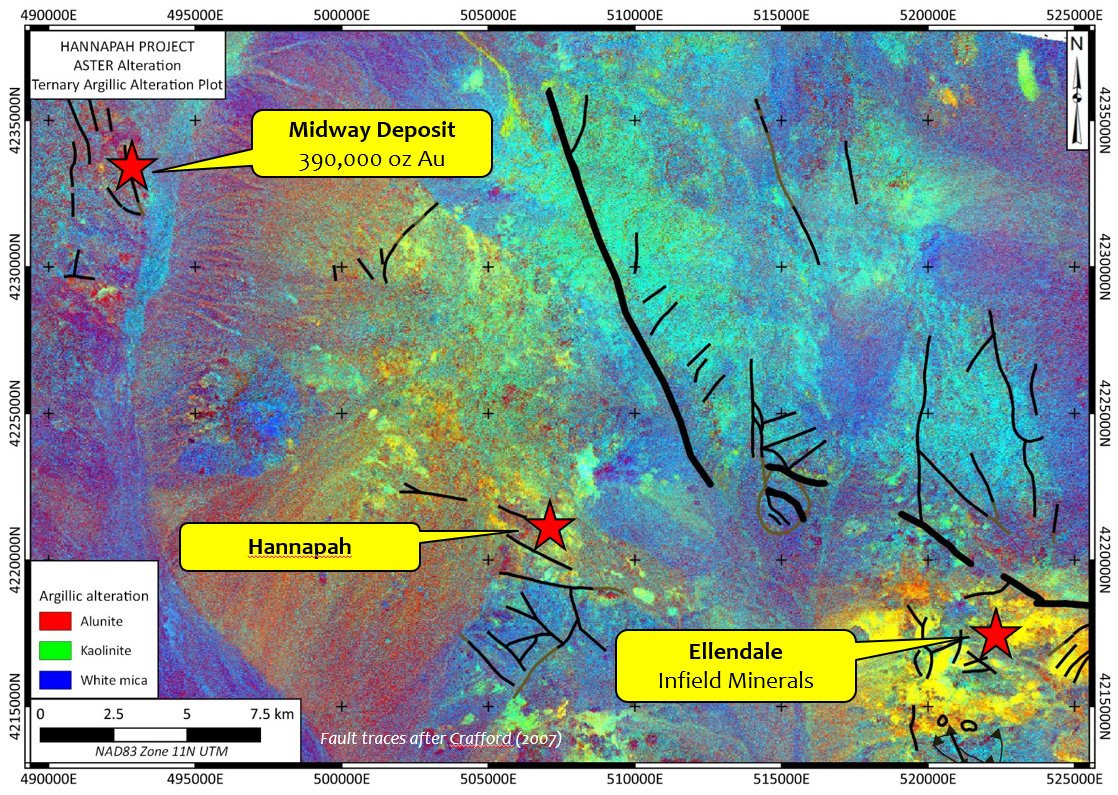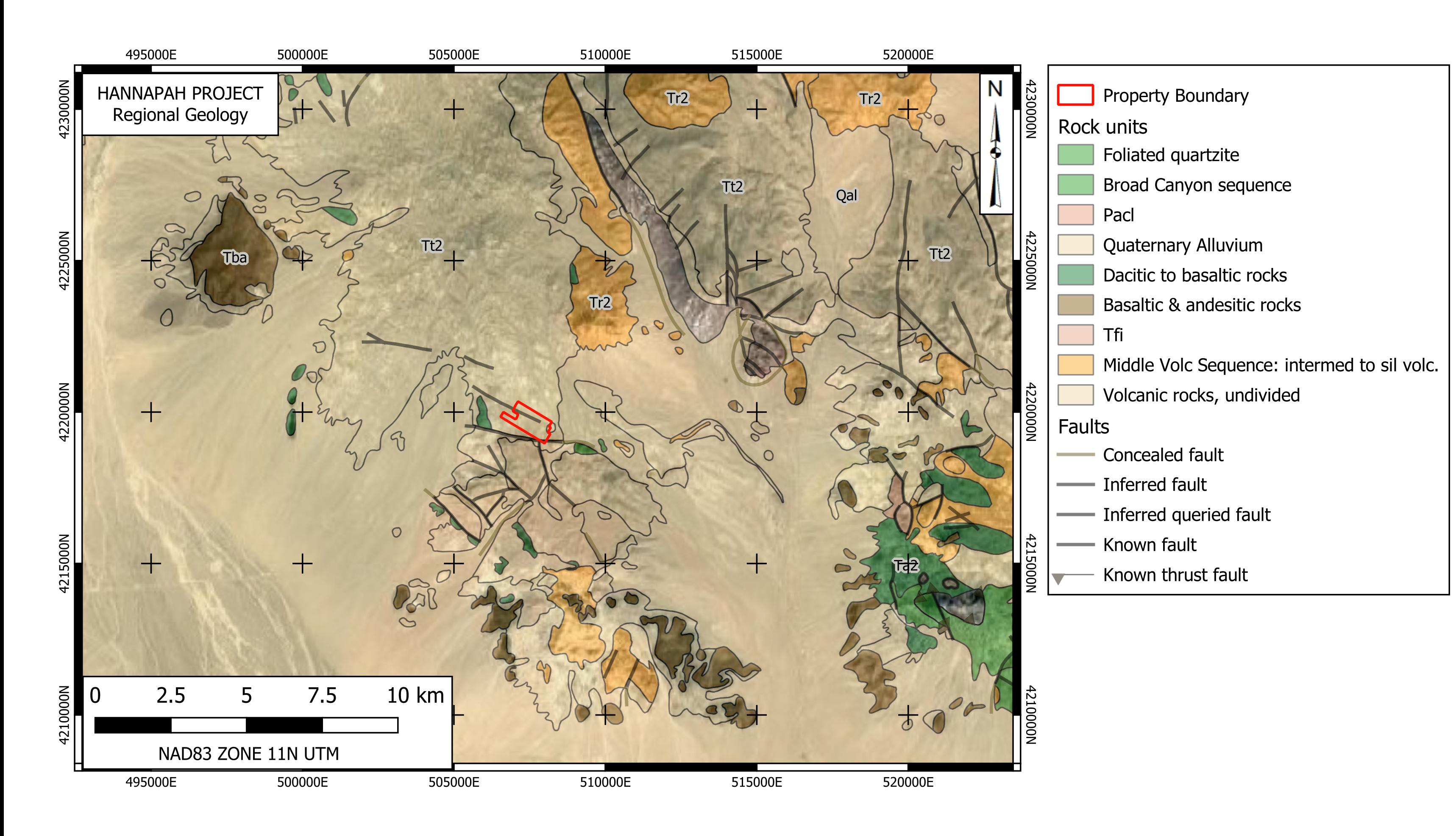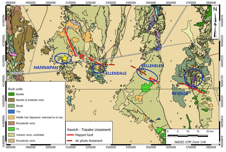 The property is underlain by Oligocene volcaniclastic rocks and lesser rhyolite cut by west-northwest trending faults. These structures host low sulphidation epithermal silver – gold mineralization in veins and stockworks. The faults are possibly part of a much larger horse-tail fracture zone at the western termination of the Kawich Toiyabe Lineament. This prominent regional structure, either a strike slip or normal fault, extends for 80 km from the Reveille Range in the east to the Monitor Range, east of Tonopah. The Reville, Bellehelen, Ellendale and Hannapah Mining Districts – all host to epithermal gold & silver mineralization – occur along the Kawich Toyaibe Lineament. ASTER hyperspectral data and structural considerations indicate that the Hannapah Project lies in a zone of horse-tail fault deformation marking the end of the structure.
