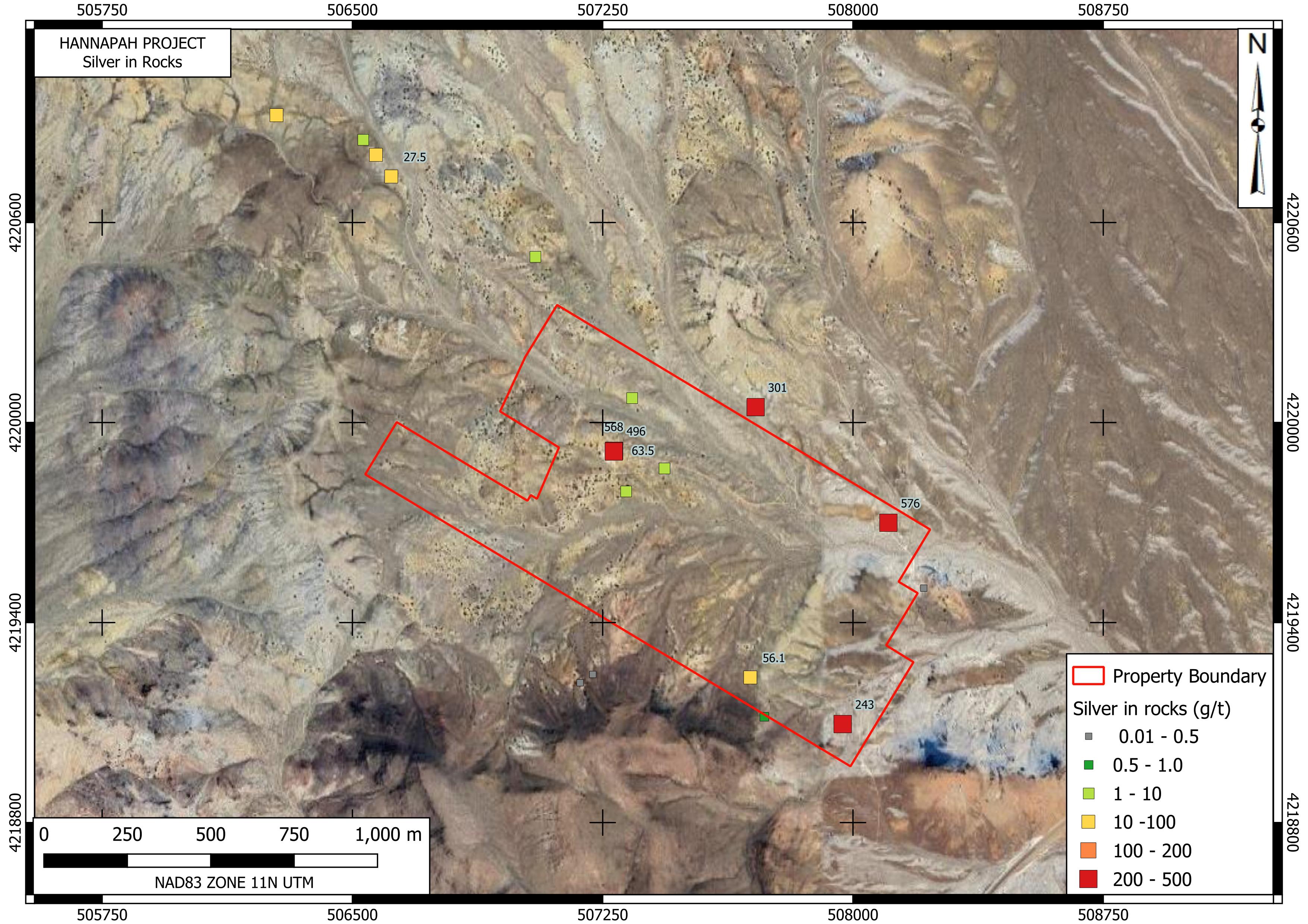 On the property, quartz-limonite-goethite-alunite / jarosite mineralization is found above the water table which occurs at a depth of about 60 m in the district. Quartz-pyrite-polybasite mineralization is found in veins below the level of oxidation and in some mine dump samples. Veins are up to about 4 m wide and persist in networks along strike for hundreds of metres near the Richardson – Hannapah Mine area. Best recent sampling results include 568 g/t Ag and 1.01 g/t Au from a composite sample of dump material at the Richardson Mine; 598 g/t Ag from a nearby grab sample; and 2.42 g/t Au and 301 g/t Ag from altered rhyolite northeast of the Richardson Mine.