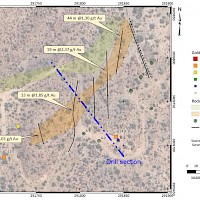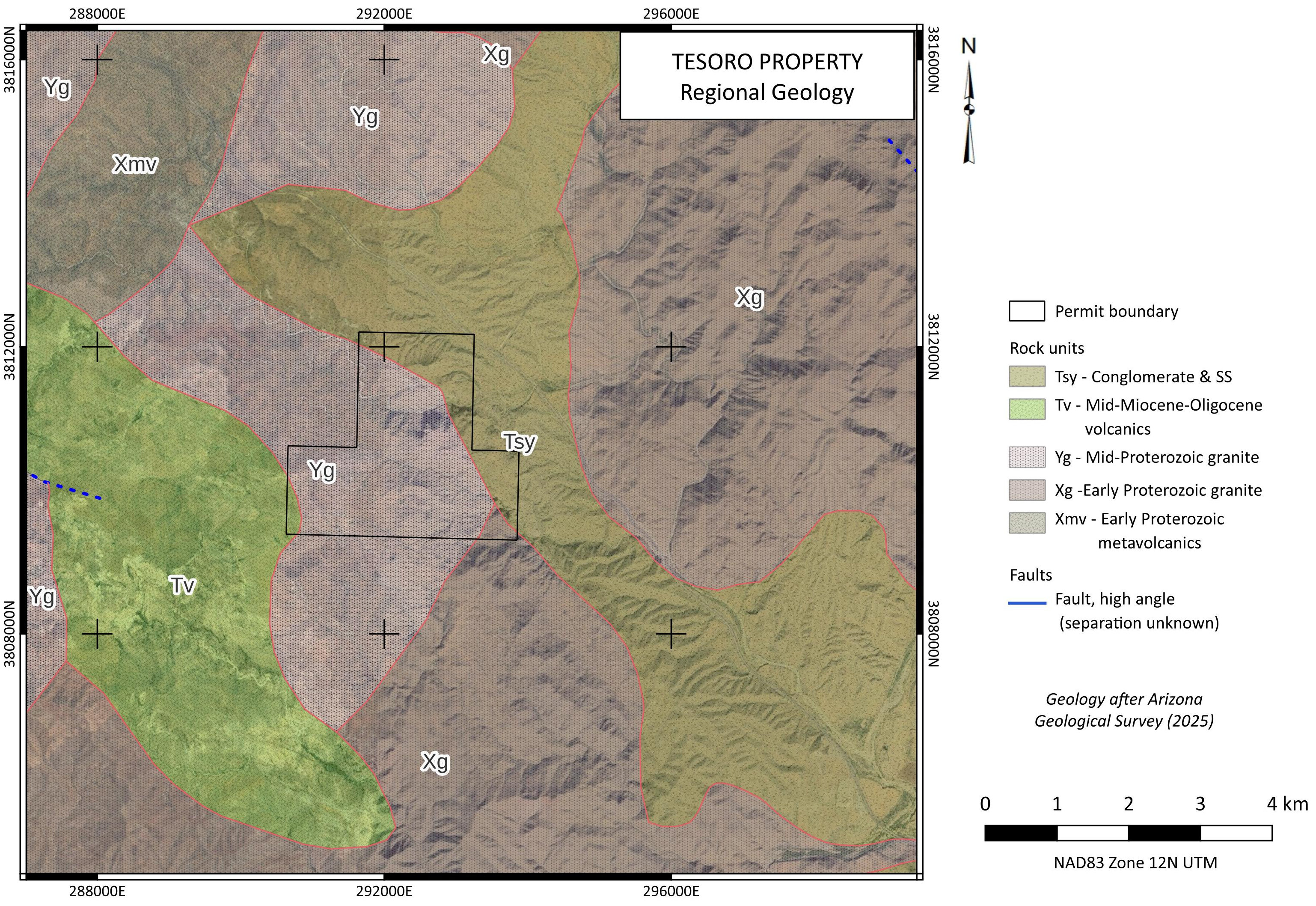 The Tesoro Project area is mostly underlain by Mid-Proterozoic granite. This unit hosts gold occurrences throughout northwestern Arizona, primarily in steeply-dipping northwest trending structuers. Historic reports describe two styles of gold mineralization on the property. The first consists of narrow, northwest-striking, steeply dipping quartz veins carrying high grade gold values, a style of occurrence common in these rocks. The second, noted at the Organ Grinder Mine, consists of wider, gently dipping altered granite carrying gold in the 1-5 g/t Au range. The latter was of particular interest to recent exploration groups who saw the potential for the property to host low grade, bulk tonnage gold amenable to heap leaching. At the Big Ben Mine, surface rock samples collected by Sage Gold returned up to 52 g/t Au while soil samples returned up to 9.2 g/t Au. A soil grid installed at this showing by HiMac Resources Ltd. detected a strong gold-in-soil anomaly, open on strike, with sample responses up to 1,500 ppb Au.