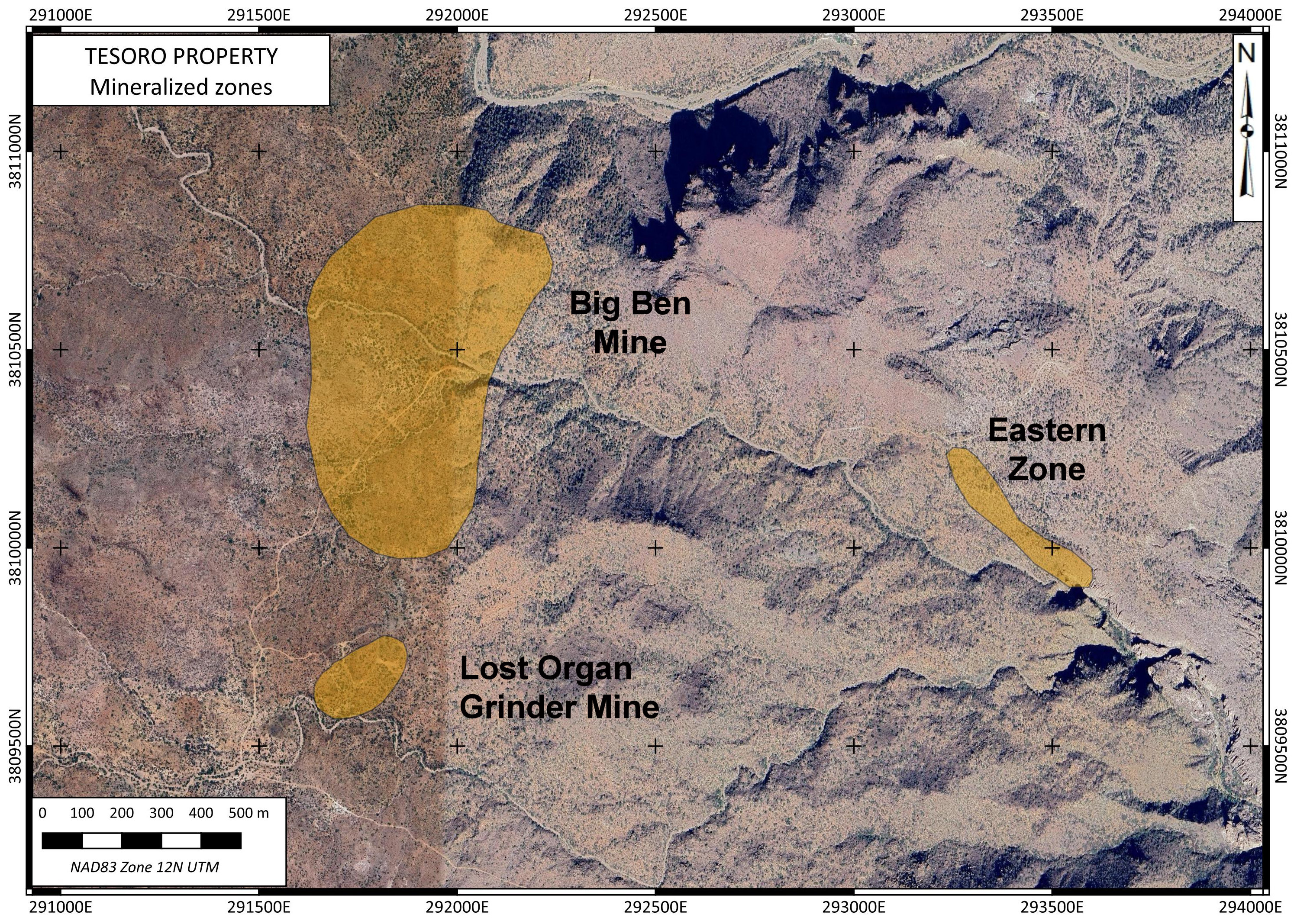 The principal showings on the Tesoro Property are denoted the Big Ben Mine and Lost Organ Grinder Mine, asserted without attribution to be the source of visible gold reported in area during the 1860’s. While there are old shafts and adits in the area, there is no information conclusively linking the two known occurrences to the reported lost mines.