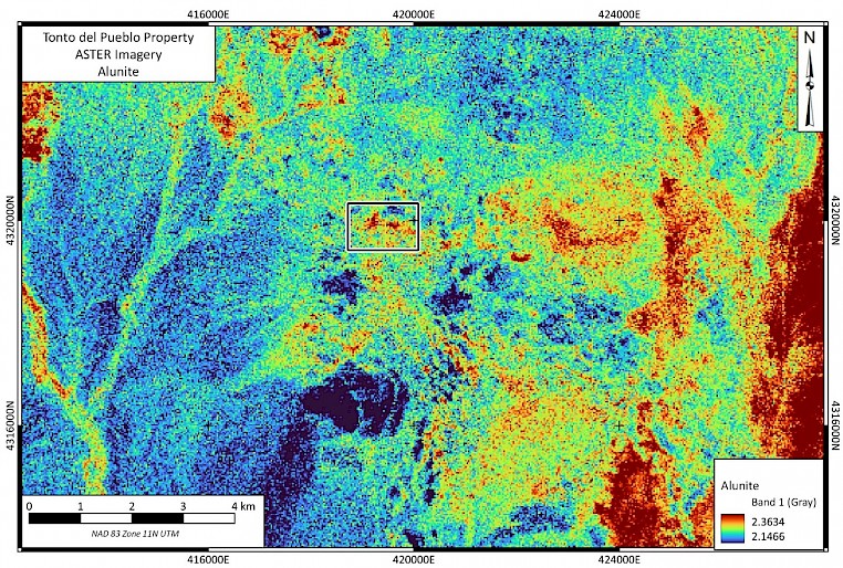 Gold mineralization at TDP may originate from any of four Oligocene caldera complexes surrounding the property. ASTER imagery indicates widespread low sulphidation style mineralization in the area including white mica throughout the Lodi Hills and alunite alteration more directly associated with gold mineralization on the property.