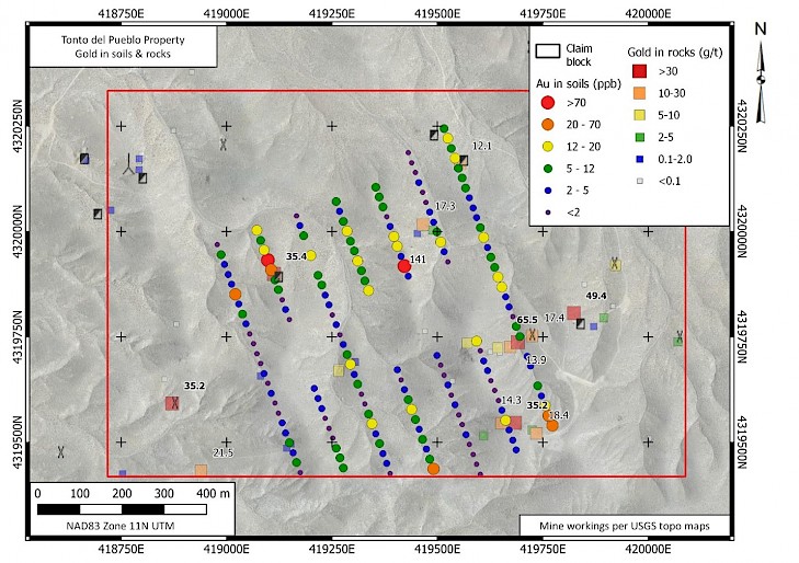 There are in excess of 50 historic workings (shafts, adits & pits) on the property and in the immediate surrounding area. Sampling at these locations has returned widespread high-grade gold. Eighteen of 54 samples collected to date at these sites have returned assays greater than 5 g/t Au with best results of 65.5 g/t Au. Soil geochemical surveys on the property have identified numerous widespread spot anomalies, some of which are associated with historic workings. Many of the soil gold anomalies are not however, suggesting there may be multiple blind sources of gold mineralization on the property.