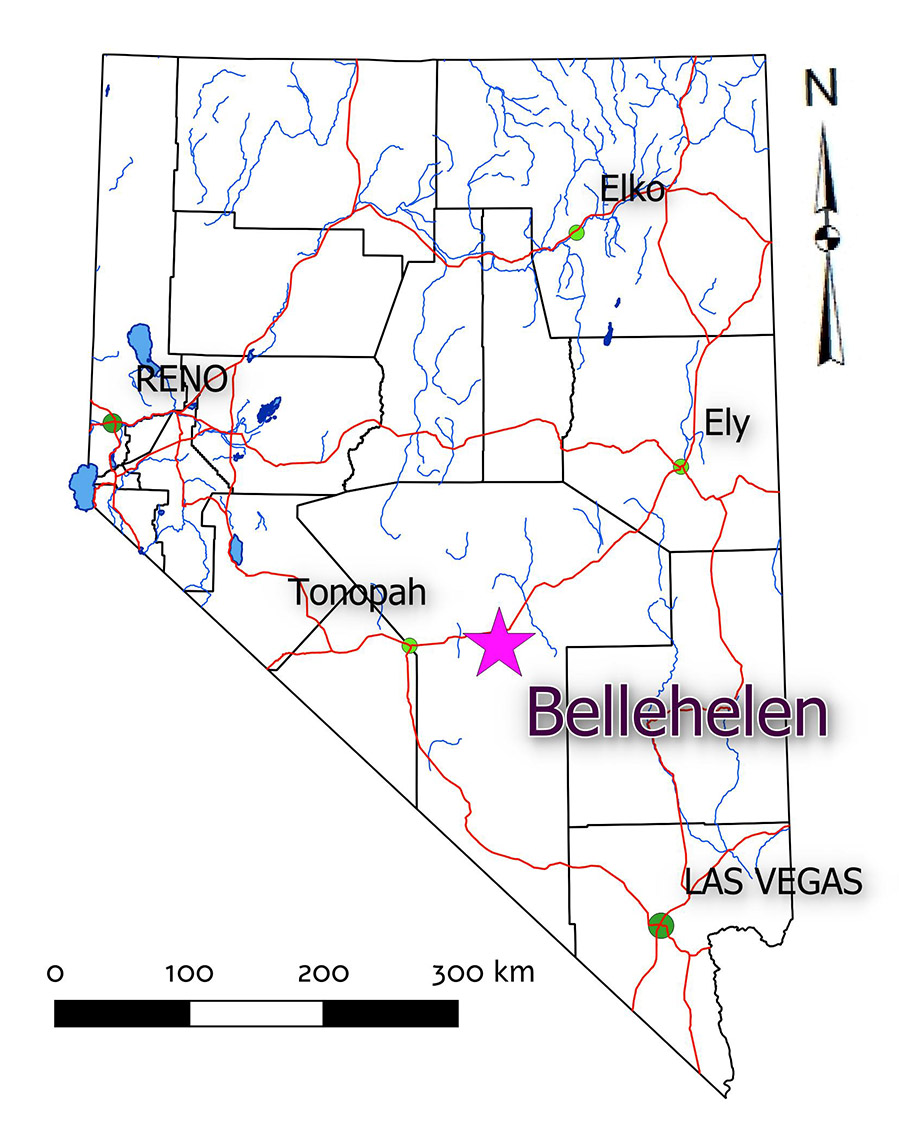 The Bellehelen Project is located in the Bellehelen Mining District, north – central Nye County. The property is 69 kilometres east-southeast of Tonopah and is accessible by road from Highway 6 via the Golden Arrow Road and Bellehelen roads. Both are gravel and much of the latter is best travelled with a 4x4 vehicle. The project consists of three claim blocks located in Township 2N Ranges 49 & 50E and Township 3N Range 49E. Two Silver Range claim blocks (88 claims) cover the principal showings in the district – the Ajax Mine, Ben Hur Mine, Neversweat occurrence and numerous smaller mineral showings. The Bellehelen (Merger) and Peterson Mines in the southern portion of the district are covered by three claims, held since 1954 by the Clifford family in Tonopah. The Bellehelen Project is located on BLM land with no surface impairments excepting that 13 claims partially or entirely lie in a Wilderness Study Area.