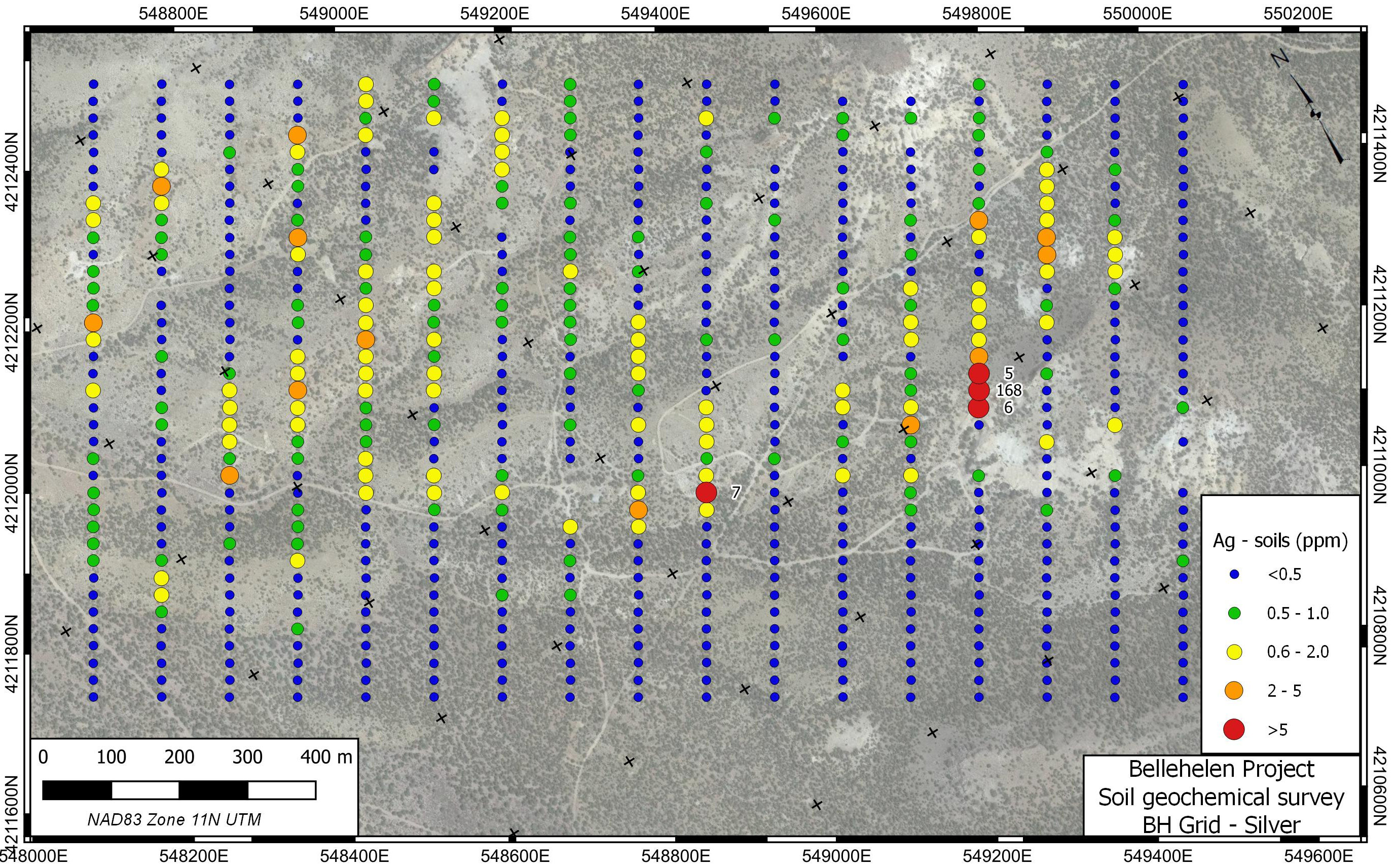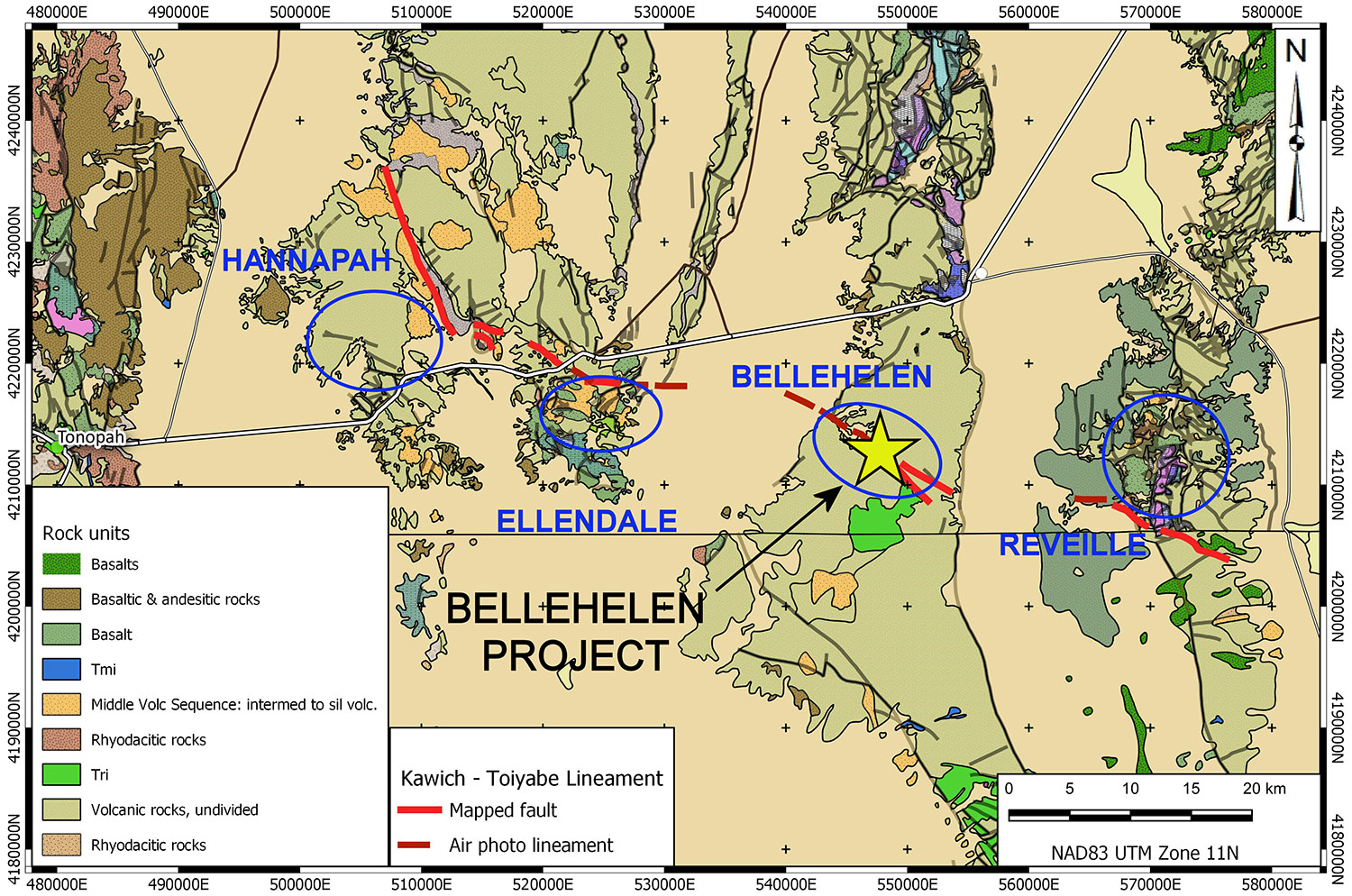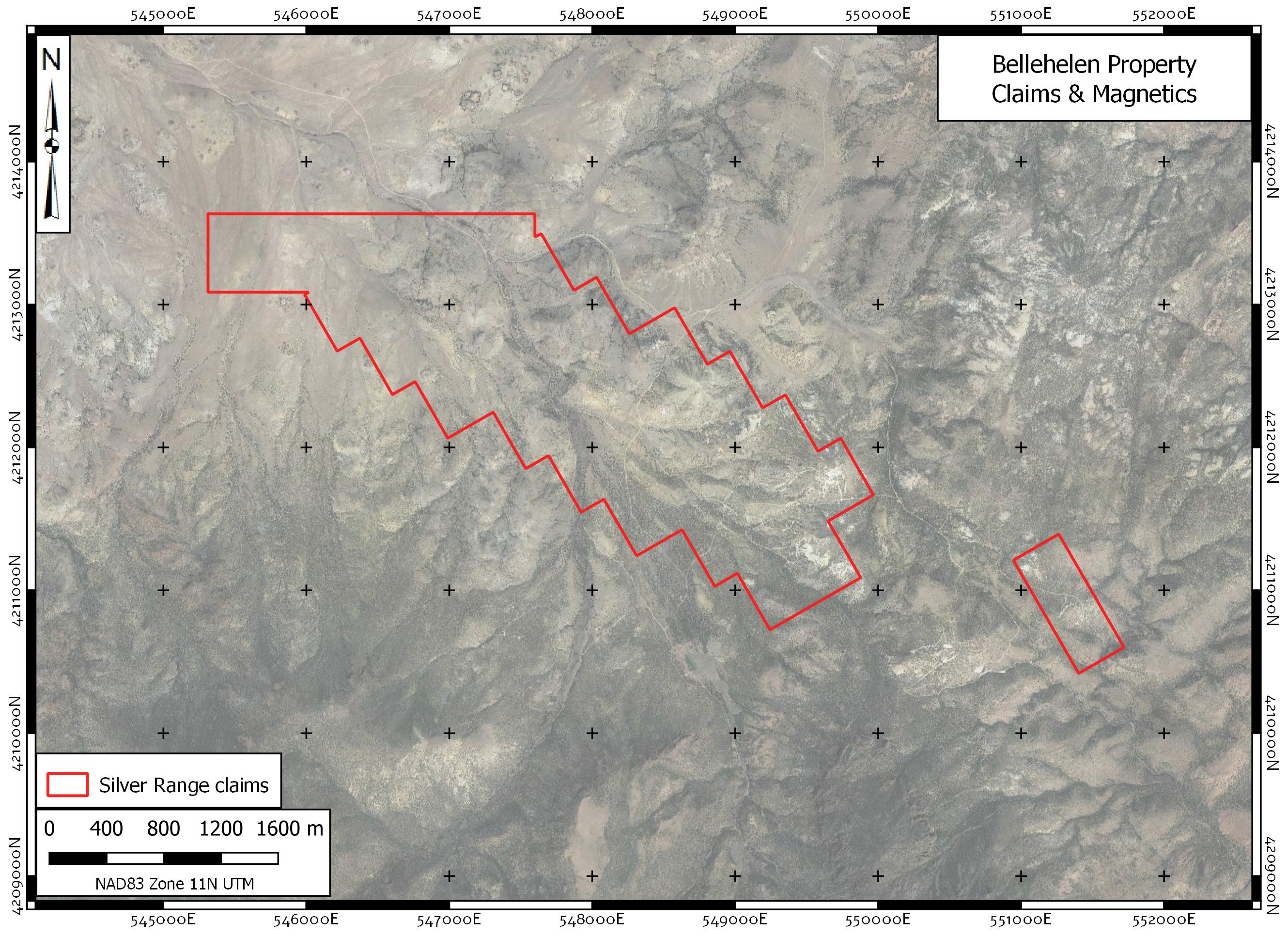 Silver and gold were discovered in the Bellehelen Mining District around 1904. The area saw limited production from 1909 to 1927 and sporadic production during the 1930s. Total documented production, mostly from the Bellehelen (Merger) Mine and adjacent Peterson Mine, is estimated at approximately 311,000 ounces silver-equivalent. This estimate does not include minor production from smaller workings throughout the mining camp. Mineralization in the Bellehelen district is low-sulphidation in character, hosted in secondary E-W striking secondary normal faults within the regional scale Bellehelen Fault Zone, a component of the larger Kawich-Toiyabe Lineament. The project area is entirely underlain by rhyolitic ash flow tuff and megabreccia (crater collapse) deposits of earliest Miocene age. Mineralization likely occurred following crater collapse driven by hydrothermal circulation along master faults in the Bellehelen Fault Zone.
