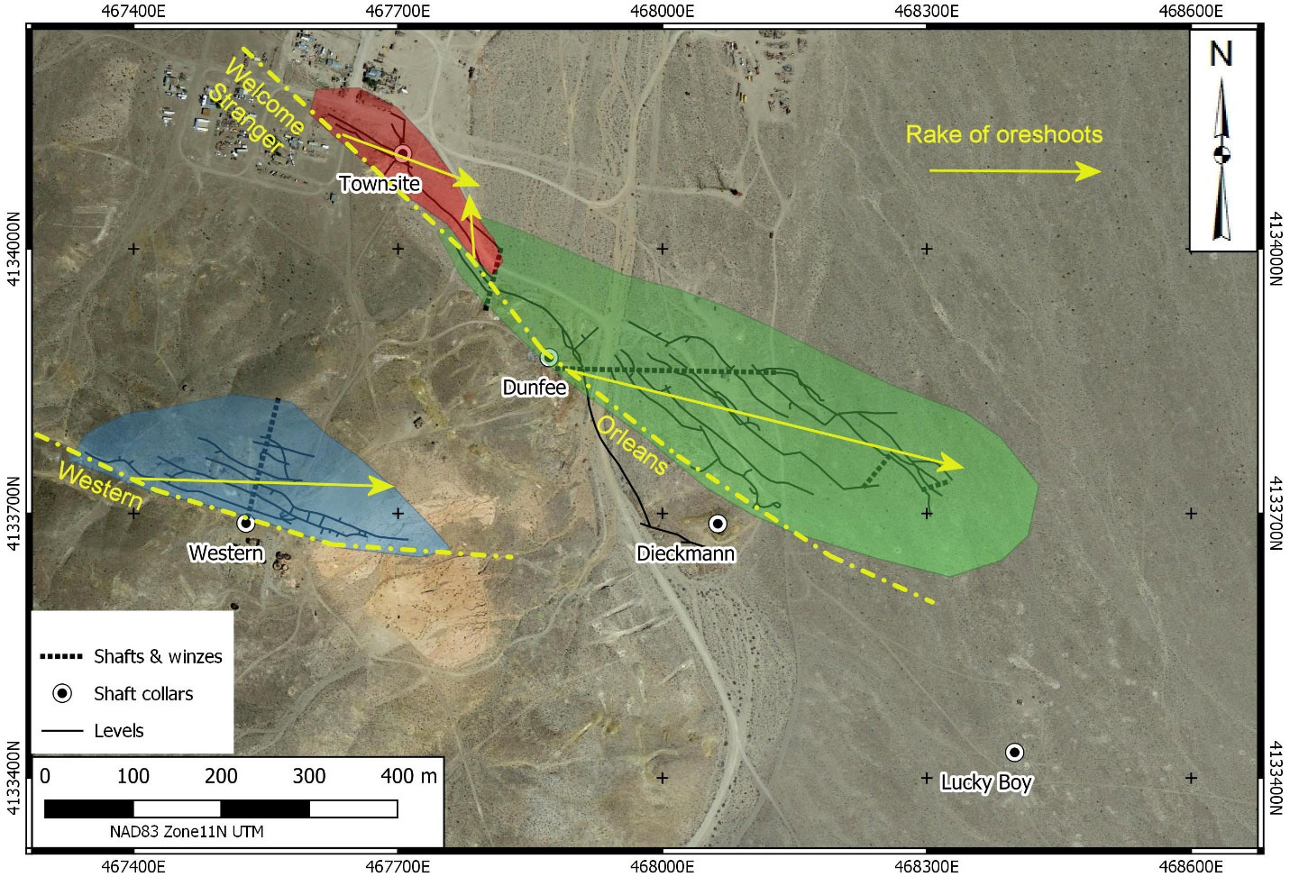 Gold Point area showing main veins, workings and ore shoots.