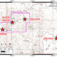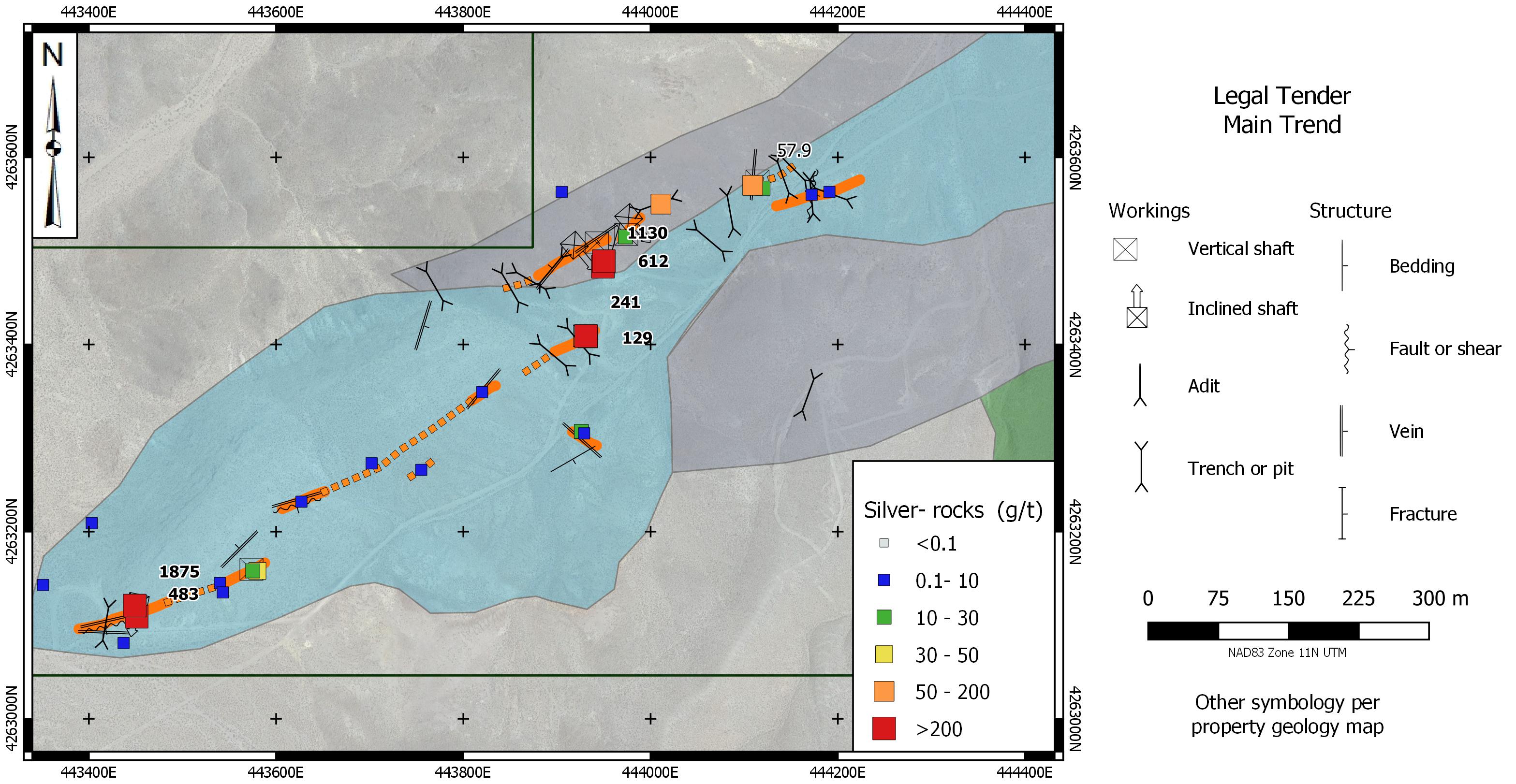 The Legal Tender Property is located in the Royston Hills in Nye County, approximately 62 km NW of Tonopah. The property covers Triassic carbonates and greenstones overlain by Tertiary volcanic rocks. Low to intermediate sulphidation mineralization occurs in veins exposed along a strike length of 1,600 metres in two trends (Main & NE Trends) . There are numerous prospect pits and shafts in these veins and notable past production from the Farris, Hyland and Black Butte mine sites.